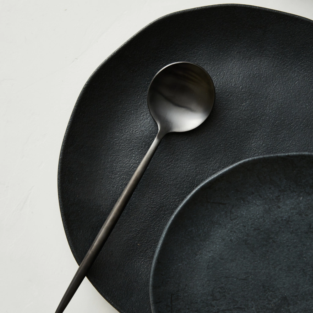 Plato playo de 26,5cm de diametro, acabado orgánico. Terminación opaca levemente satinado, color carbon. Material: gres. Apto lavavajillas, microondas y horno. Recomendacion: utilizar cubiertos de aleacion dura, para cuidar el plato.