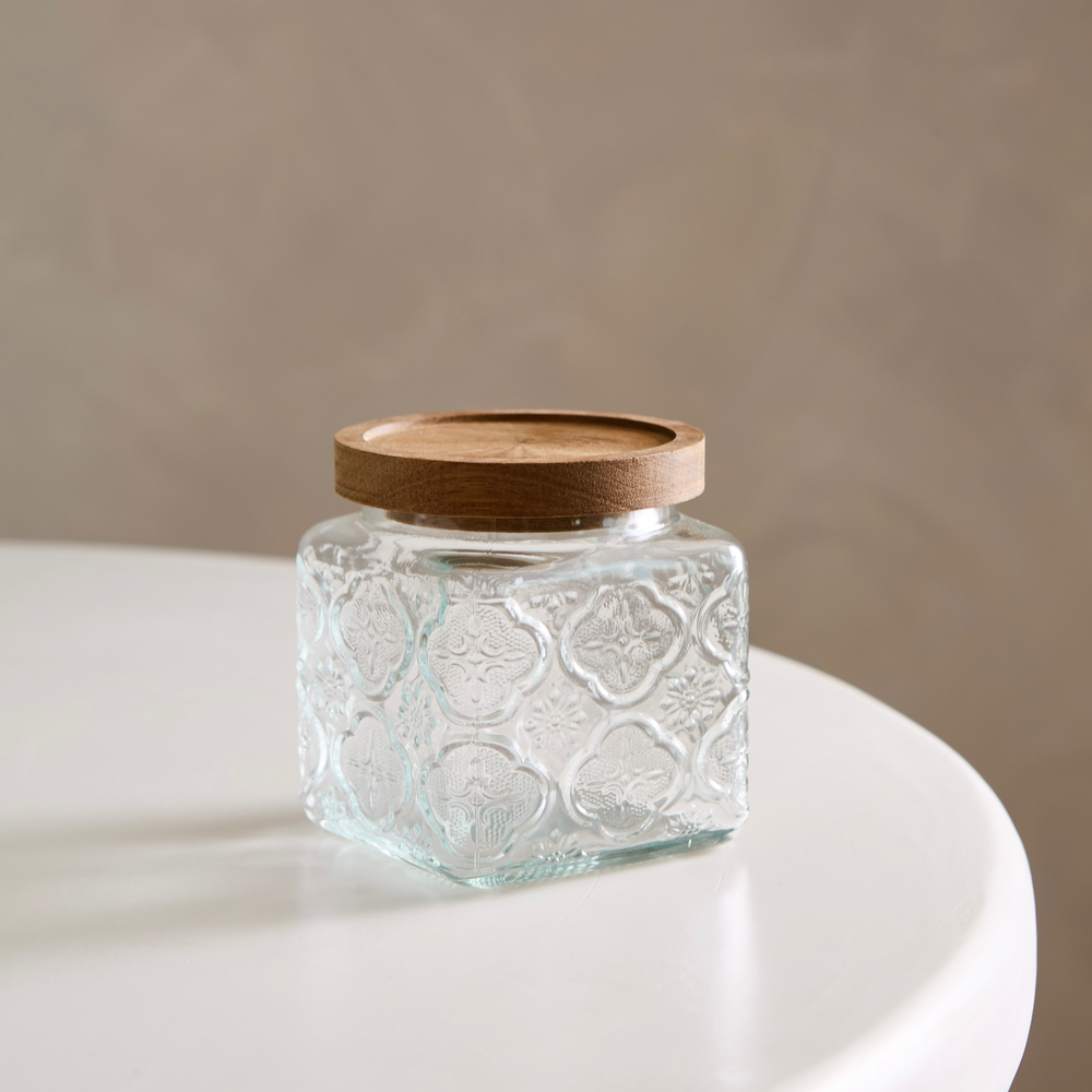 Frasco de vidrio labrado hermetico con tapa de madera.