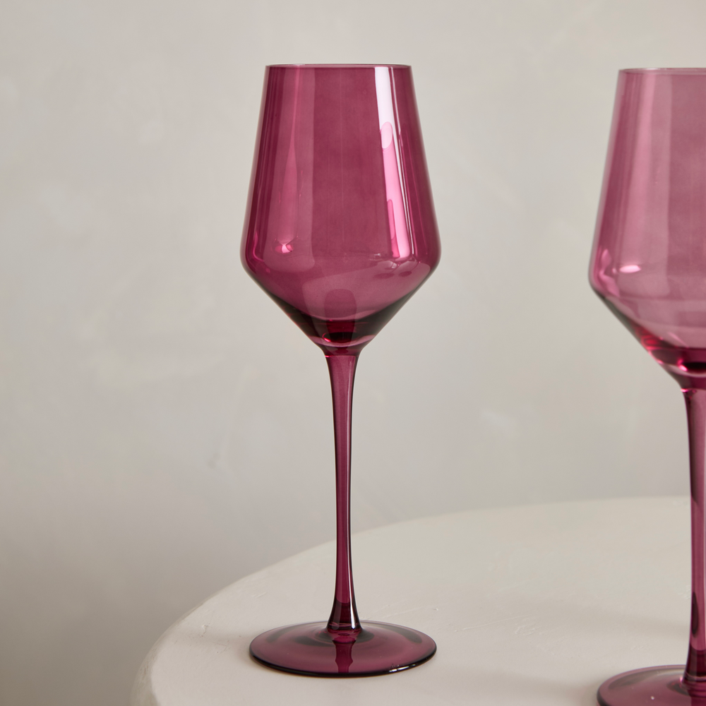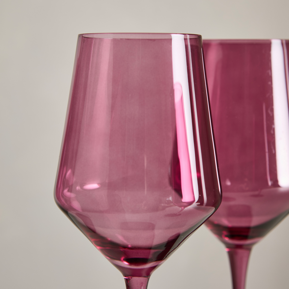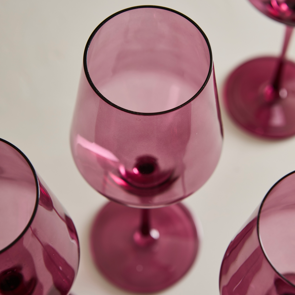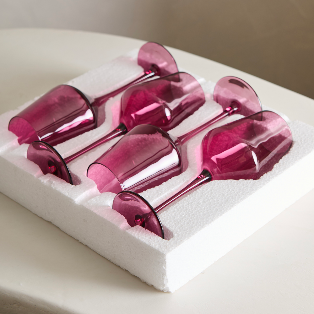 Set de 4 copas de vino de cristal rosa. Capacidad: 420ml Medidas: 6,3x24cm Packaging de telgopor, listo para vender online. No aptos lavavajillas.