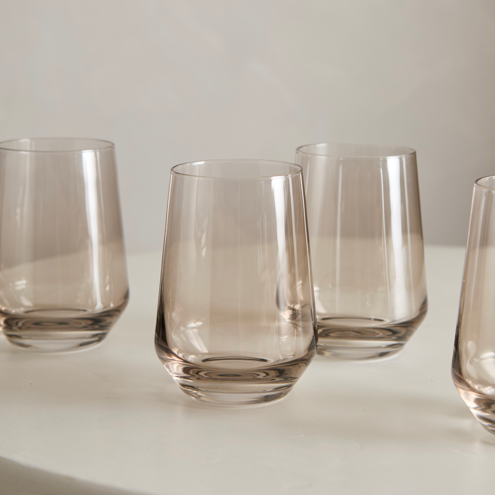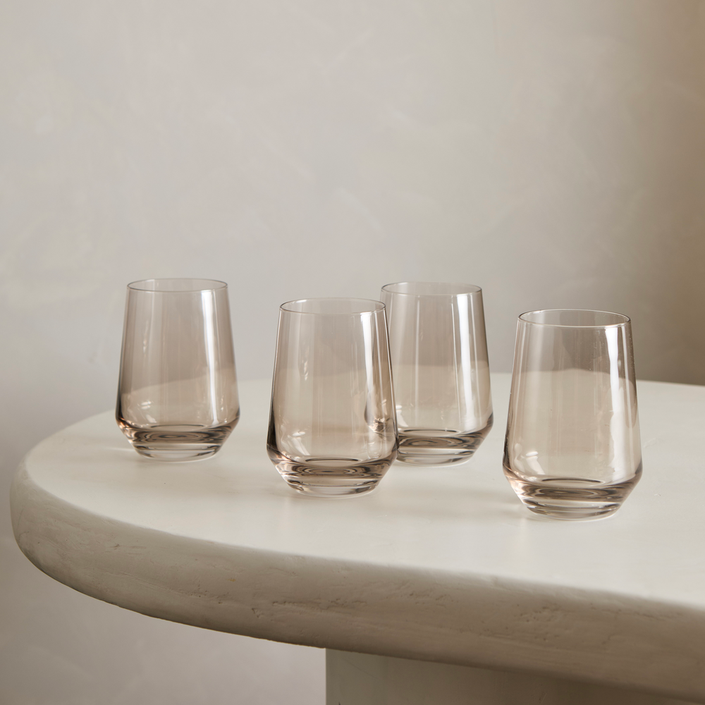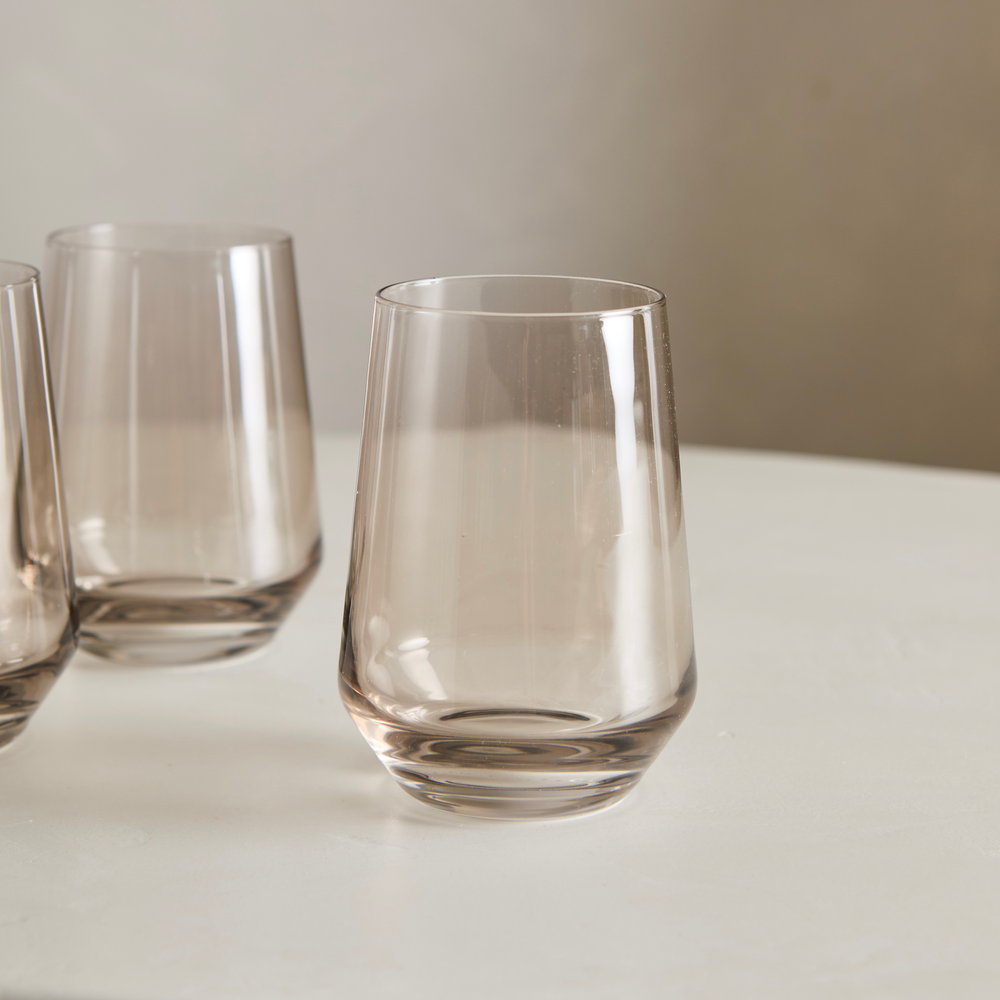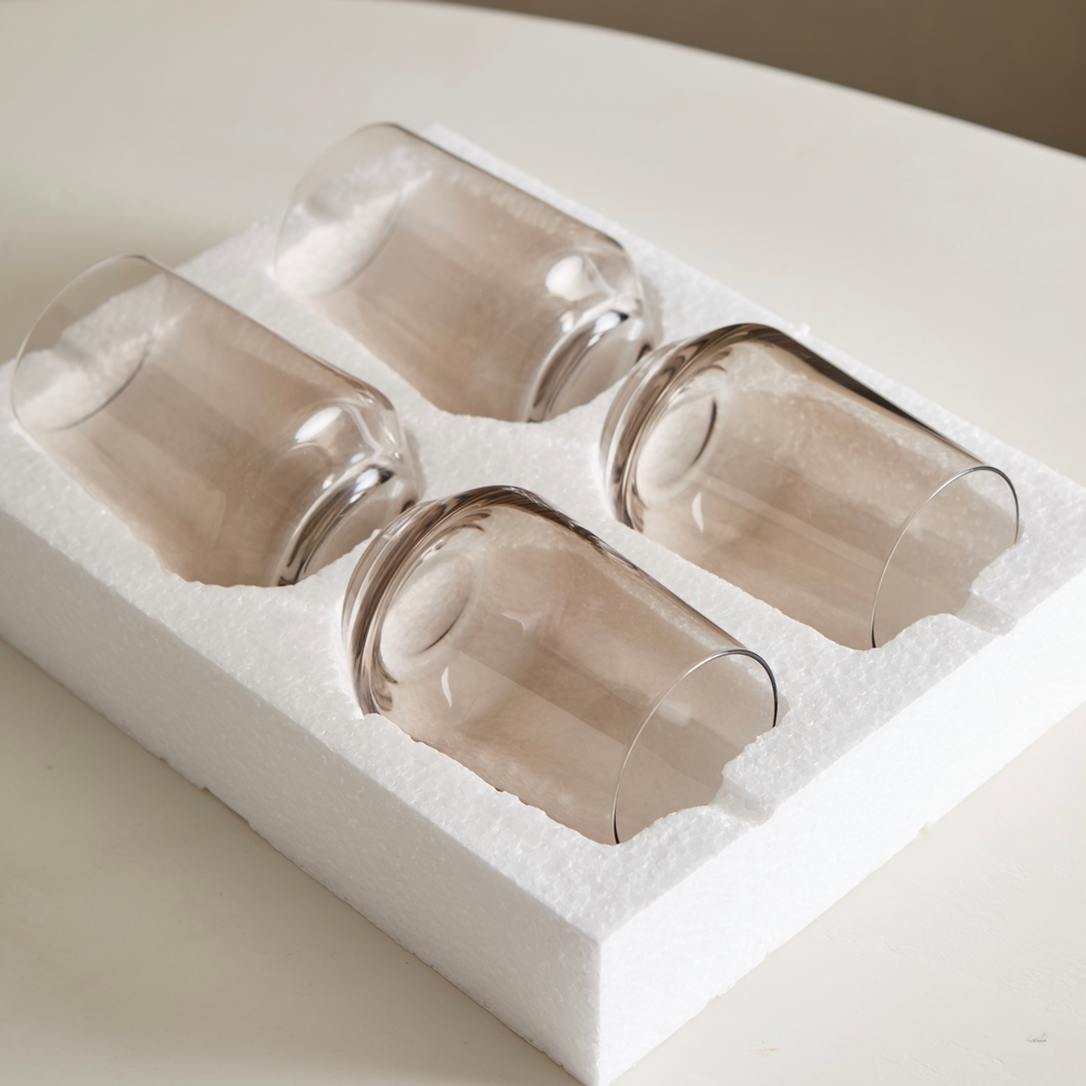 Set de 4 vasos de cristal beige. Medidas: 10,5x11cm. Packaging de telgopor, listo para vender online. No aptos lavavajillas.