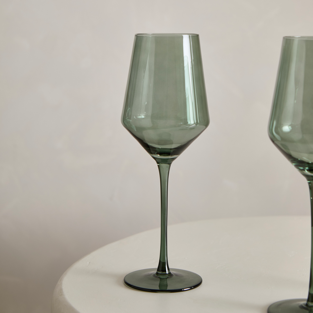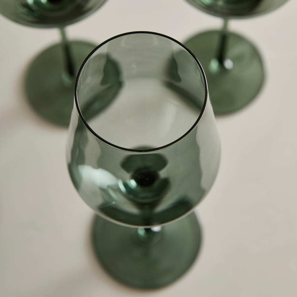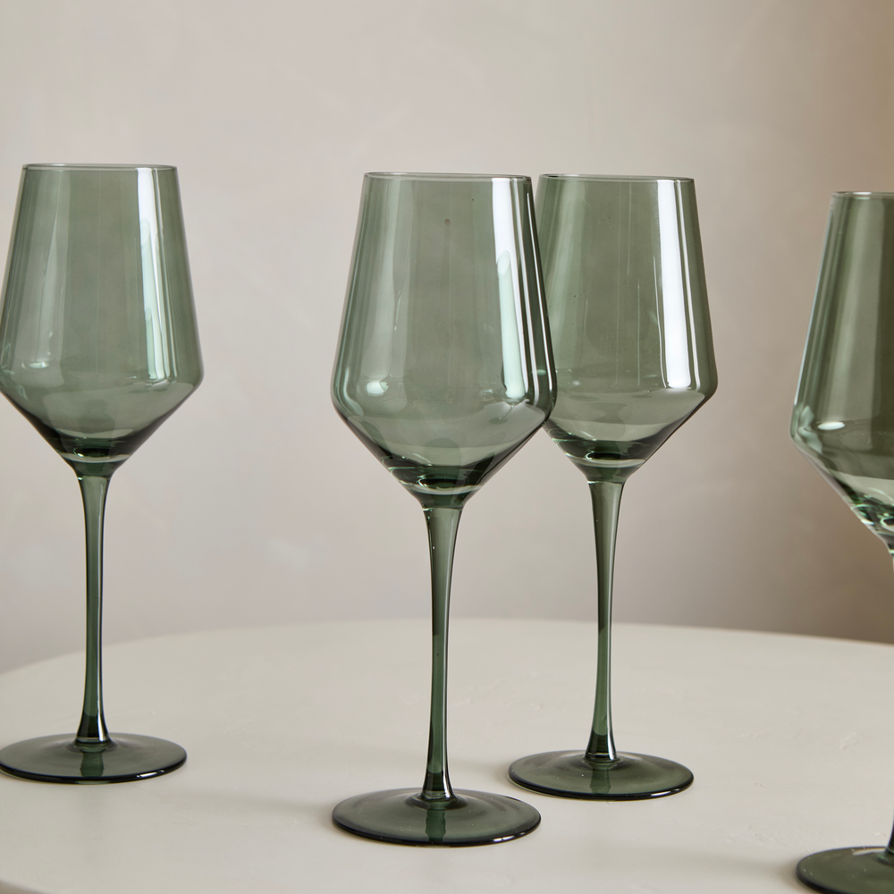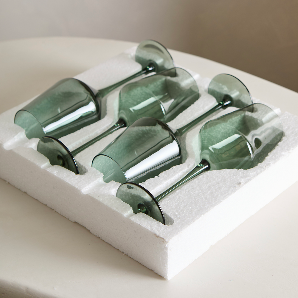 Set de 4 copas de vino de cristal verde ingles. Capacidad: 420ml Medidas: 6,3x24cm Packaging de telgopor, listo para vender online.