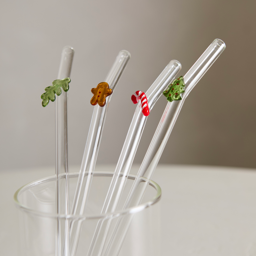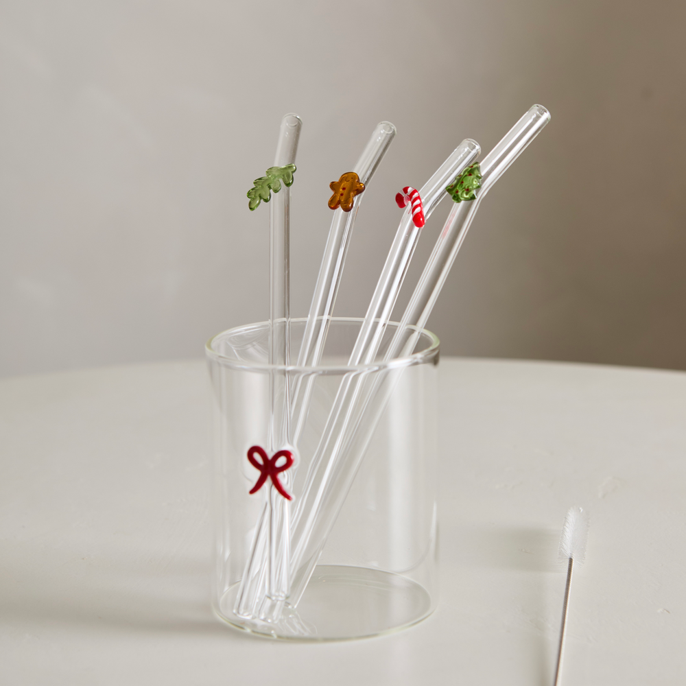 Set de 4 sorbetes de vidrio con aplique de navidad. Incluye cepillo para lavar.