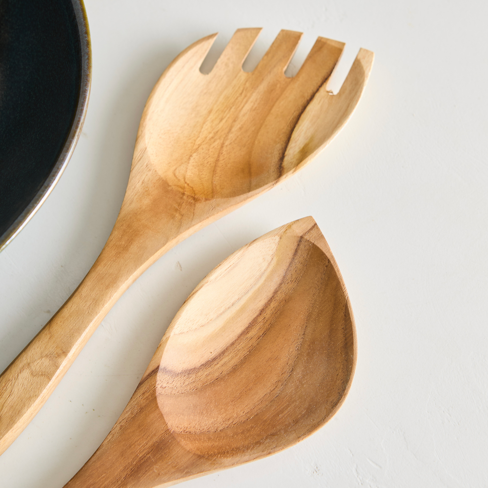 Set de cubiertos de ensalada de madera teca de una forma única.