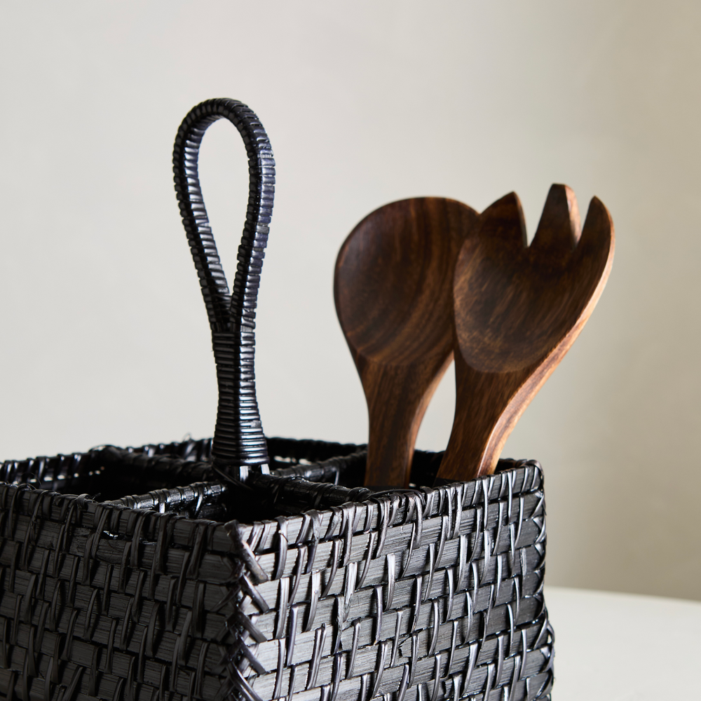 Porta cubiertos de bambu y ratan, de forma cuadrada, de color negro. Medidas: 19cm x 19cm x 12cm de altura / 27cm de altura total.