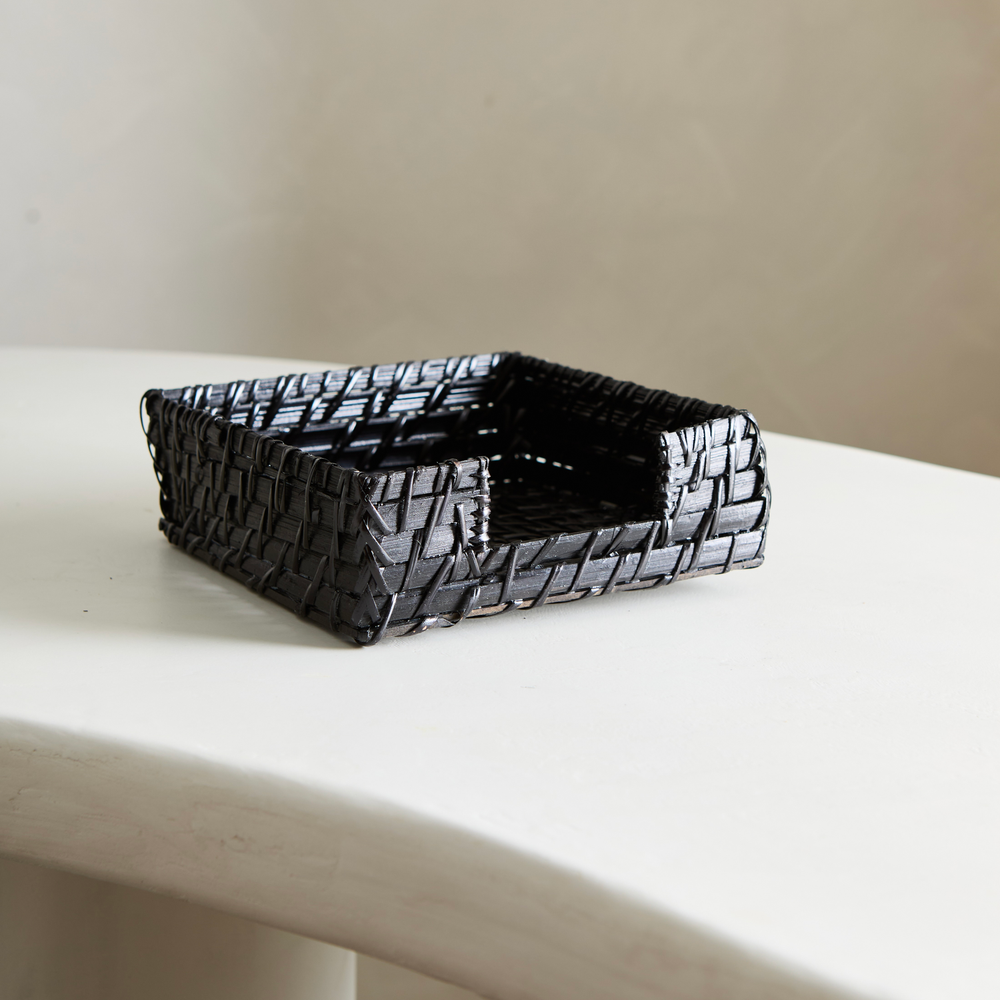 Servilletero de bambu y madera, trenzado en color negro. Medidas: 18x18x6cm de altura.