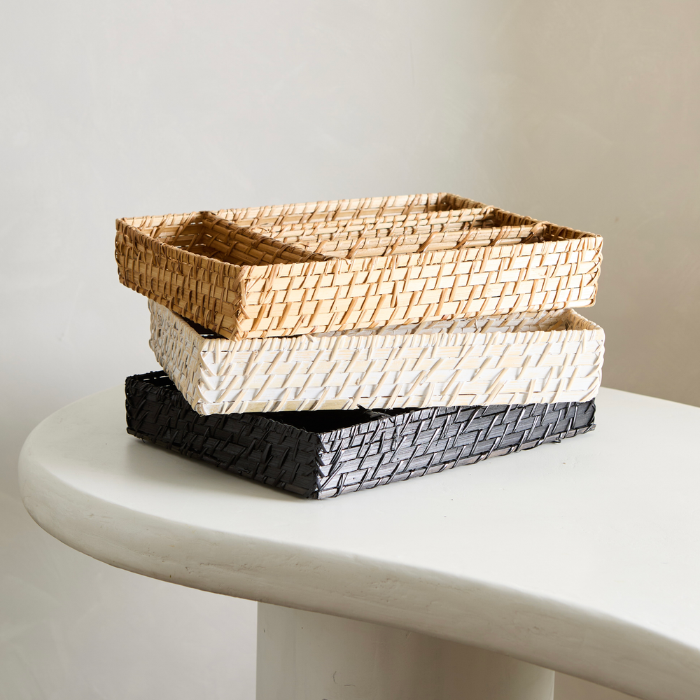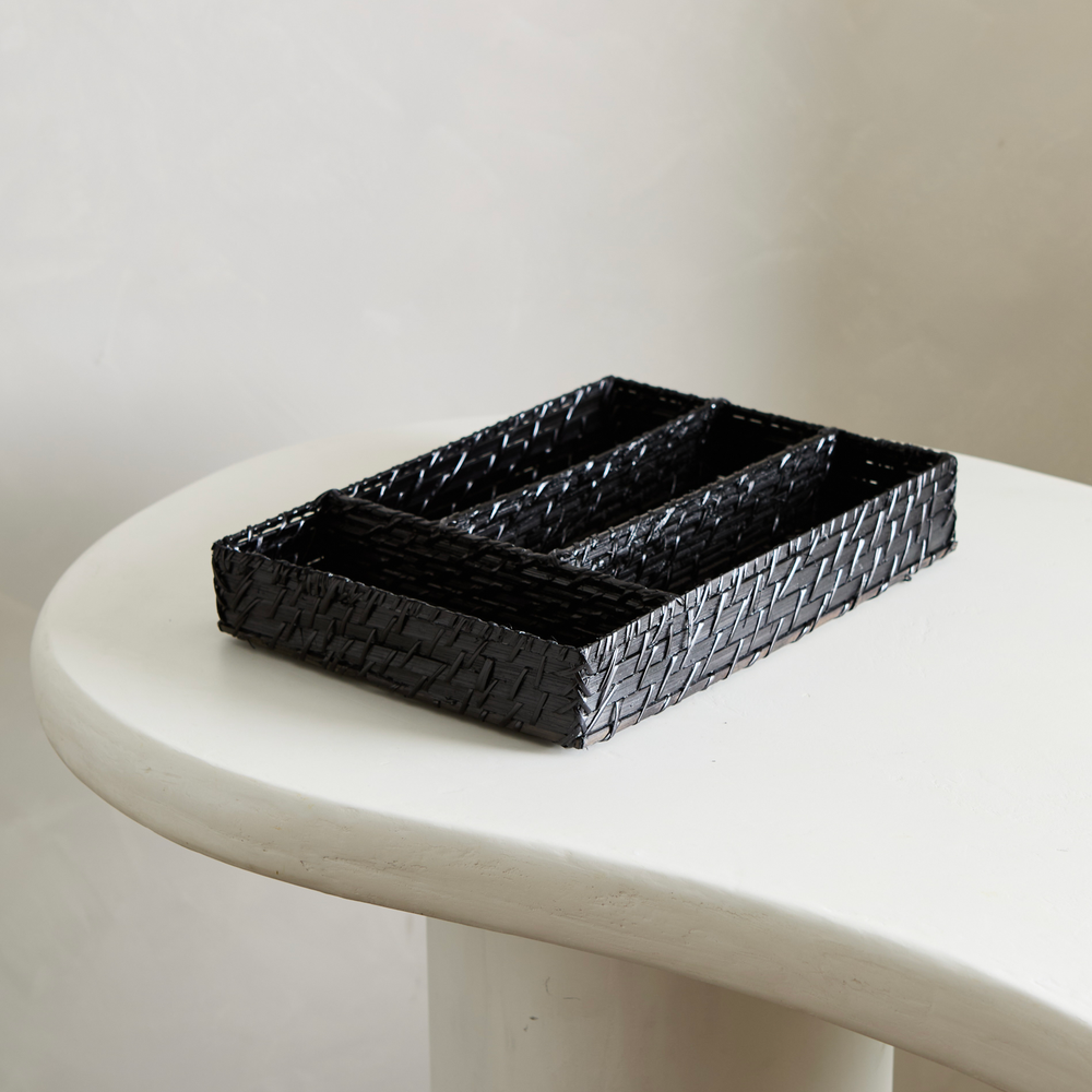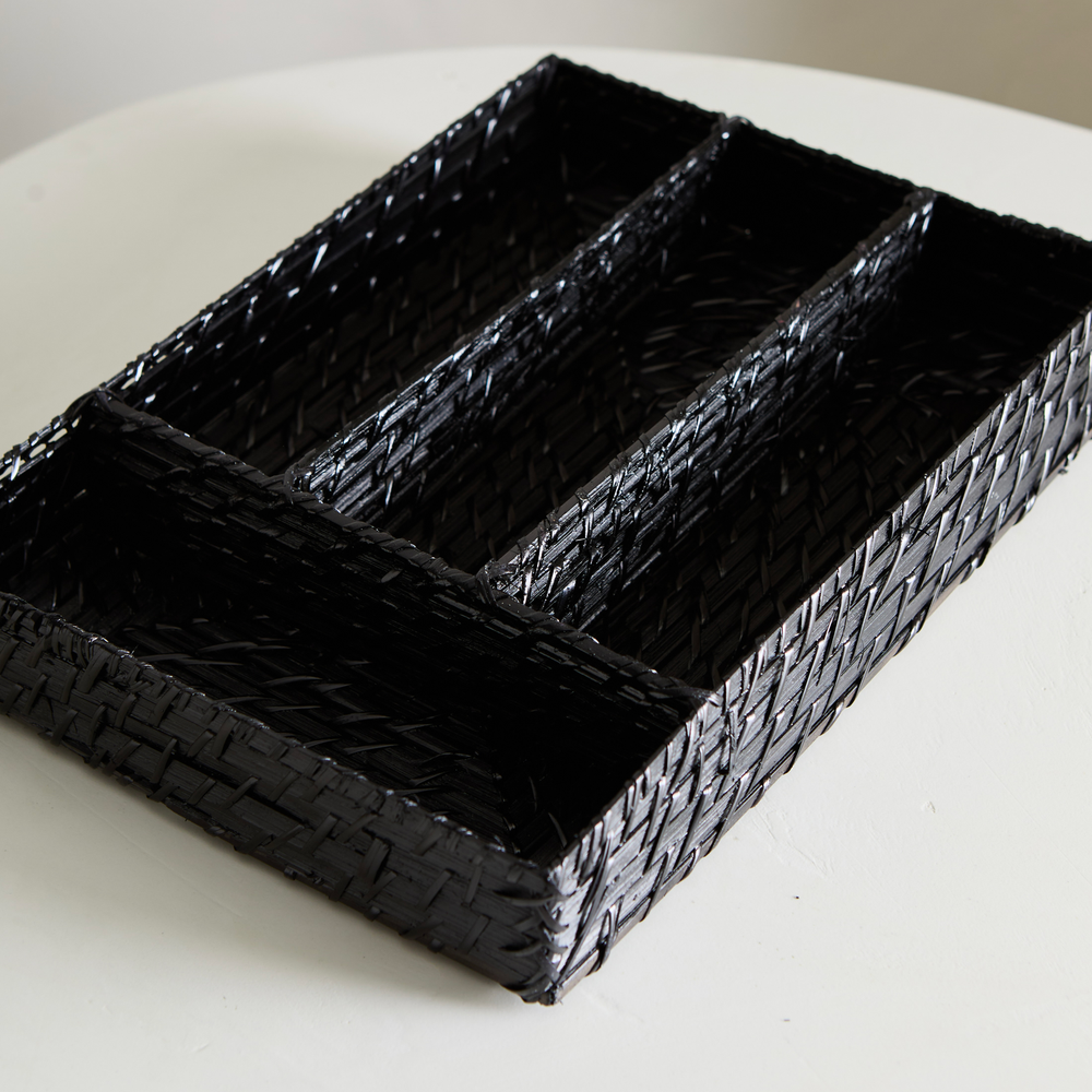 Cubiertero para cajon, de bambu y ratan, en color negro. Con lugar para tenedores, cuchillos, cucharas y cucharitas. Medidas: 34cmx24cmx6cm de altura.