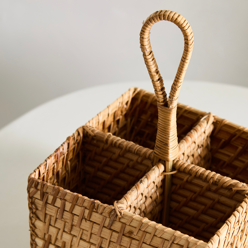 Porta cubiertos de bambu y ratan, de forma cuadrada, de color natural. Medidas: 19cm x 19cm x 12cm de altura / 27cm de altura total.