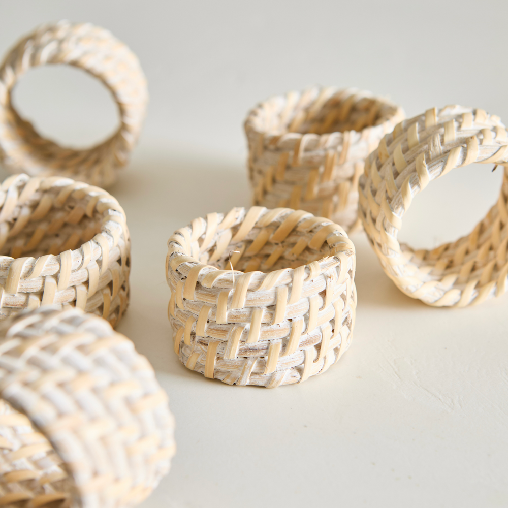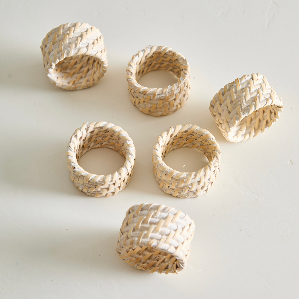 Set de 6 porta servilletas circular, de ratan y bambu, en color blanco. Medidas: 5cm de diametro x 3cm de alto.