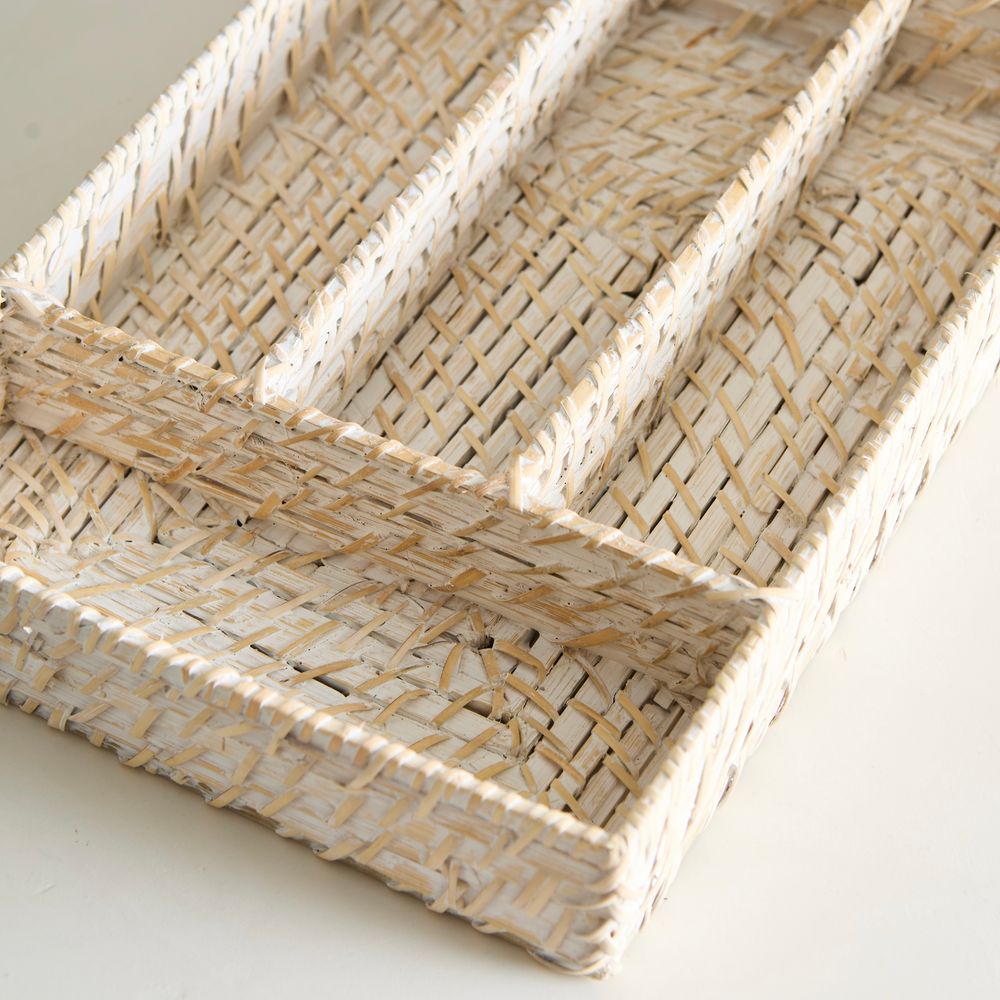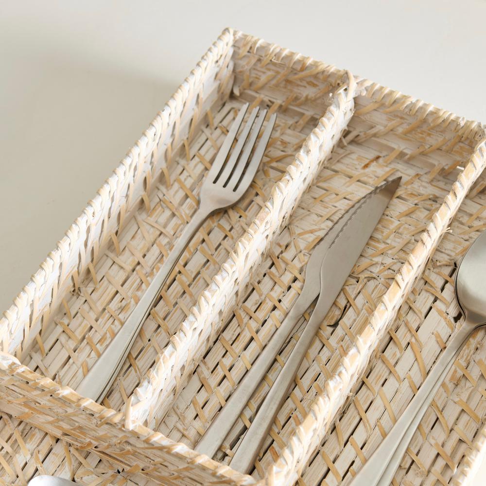 Cubiertero para cajon, de bambu y ratan, en color blanco. Con lugar para tenedores, cuchillos, cucharas y cucharitas. Medidas: 34cmx24cmx6cm de altura.