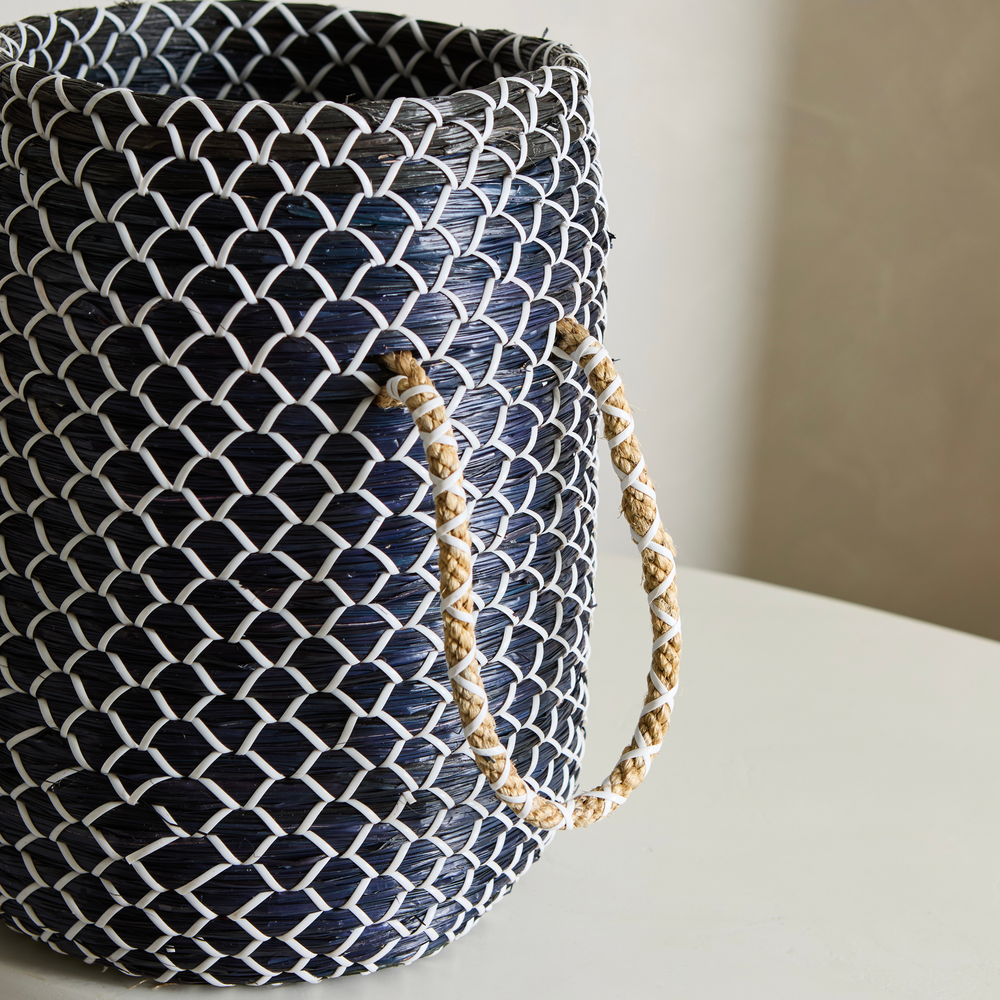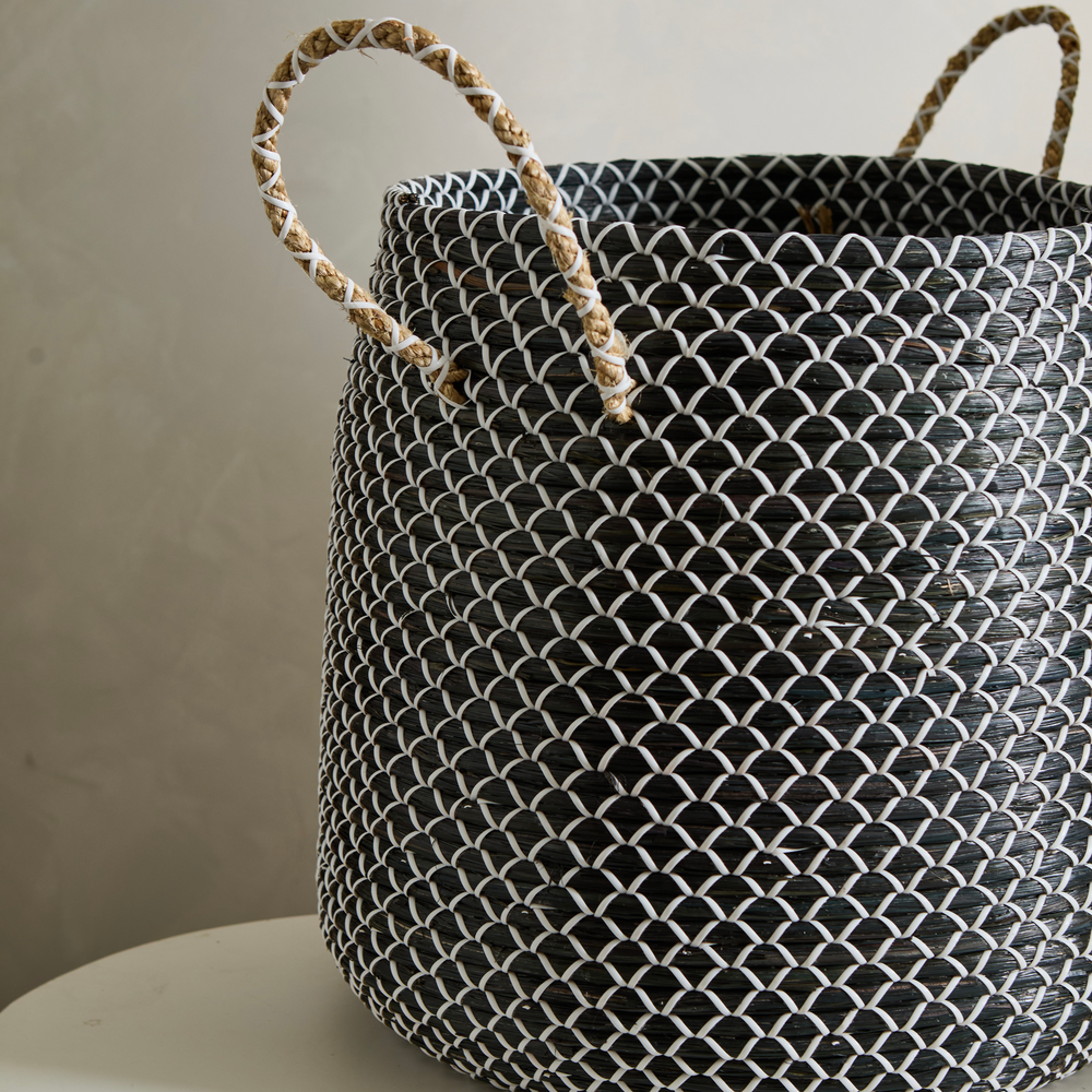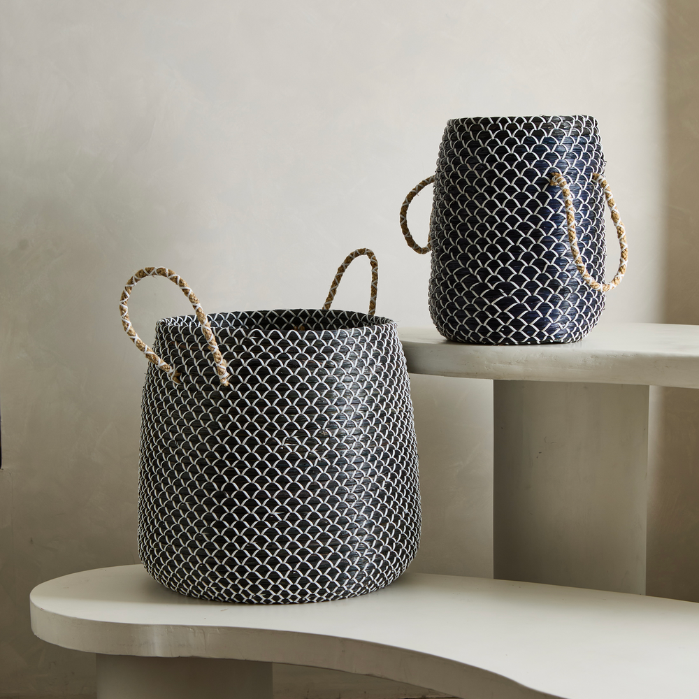 Set de 2 canastos con manija, en color negro. Medida chico: 23cm de diametro superior x 26cm de diametro inferior x 36cm de alto / 47cm de alto con manijas. Medida grande: 36cm de diametro superior x 43cm de diametro inferior x 43cm de altura / 55cm de altura con manija.