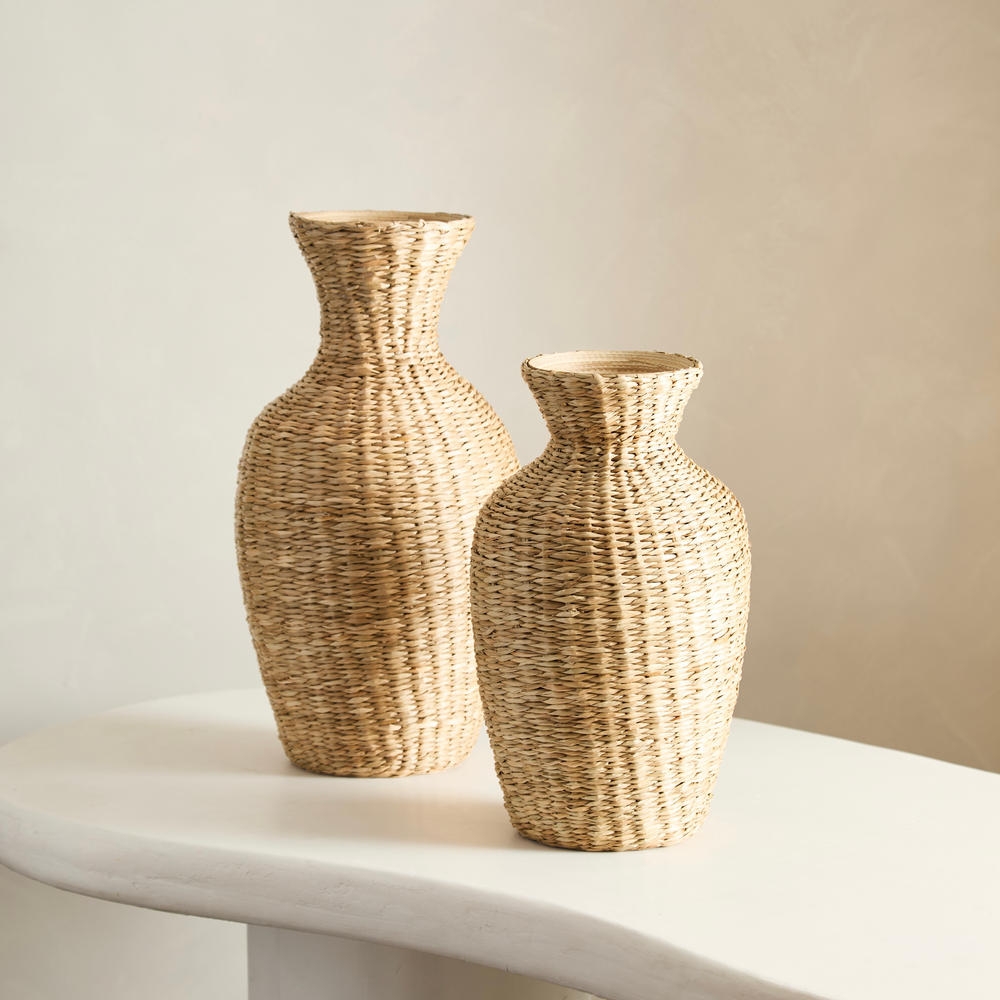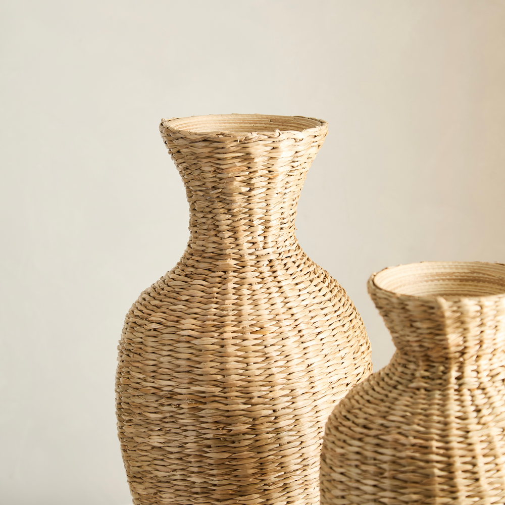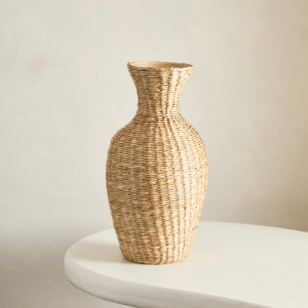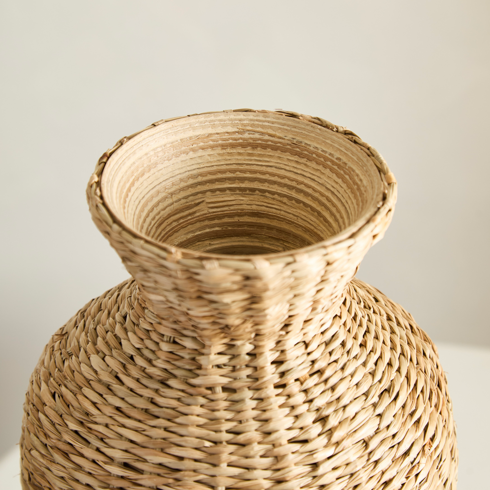 Florero o vasija, hecha en fibras naturales y bambu por dentro.
