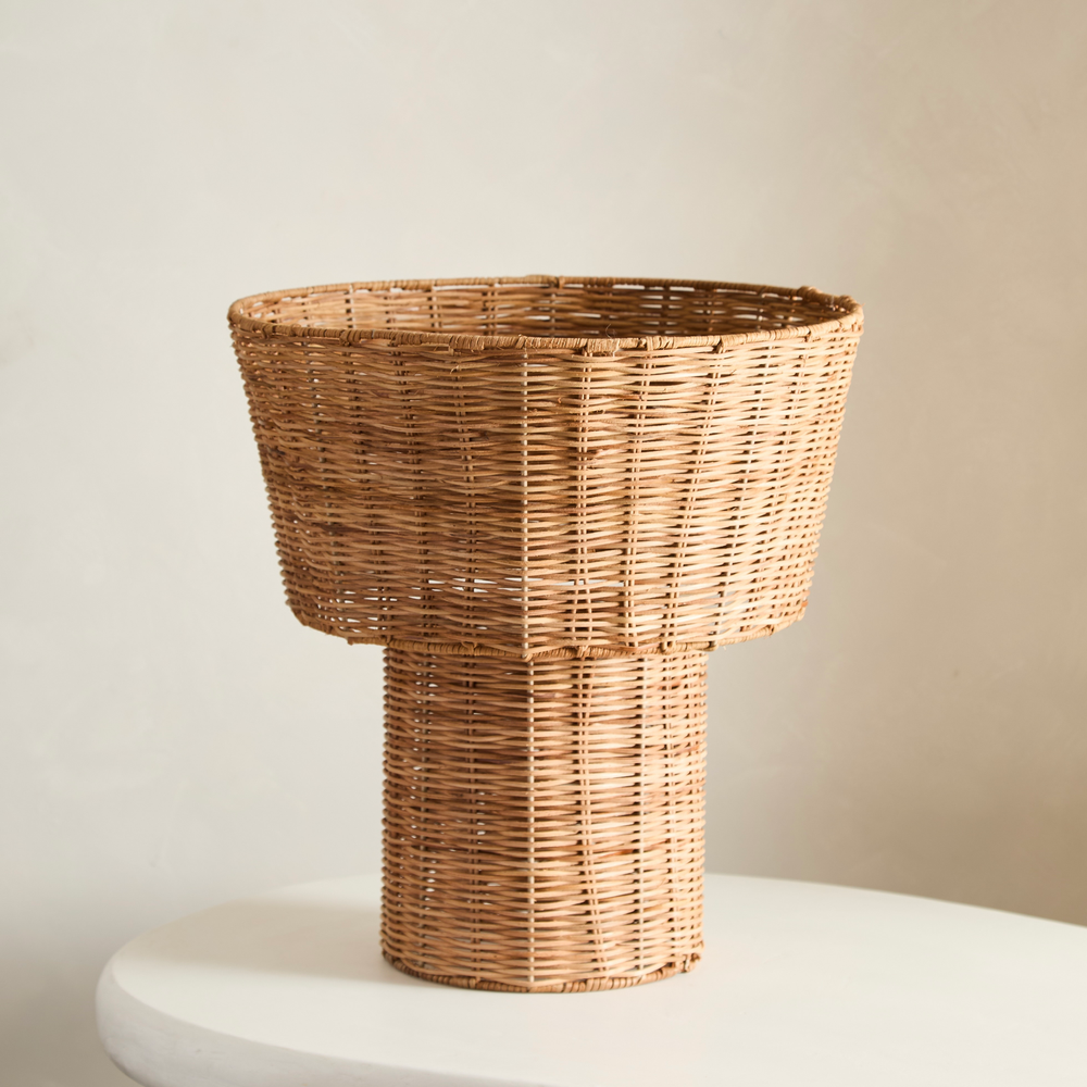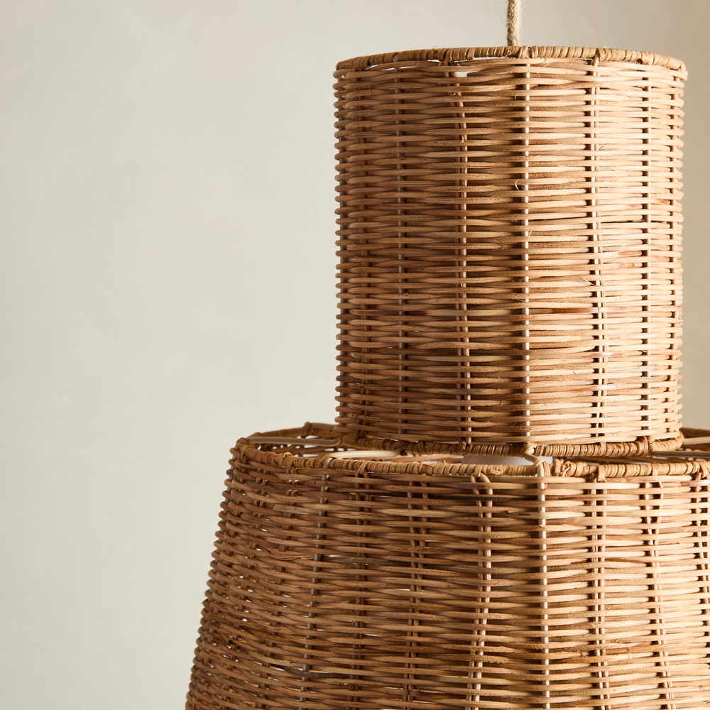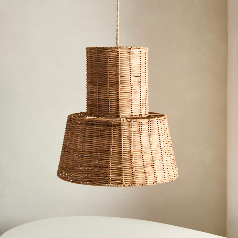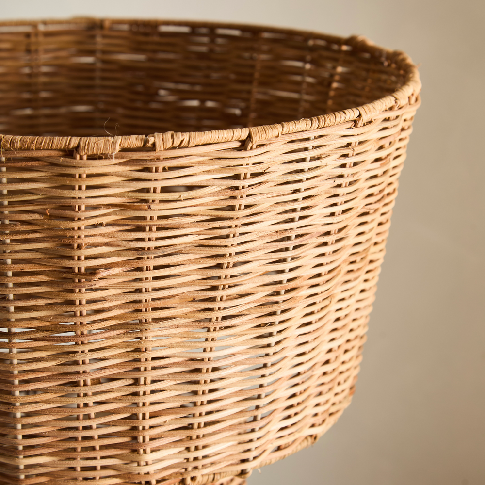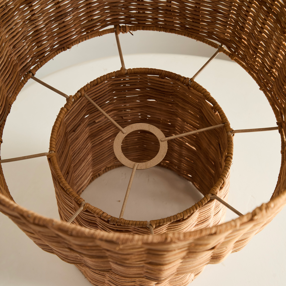 Velador de ratan con estructura metalica. Se puede utilizar tambien como lampara colgante.