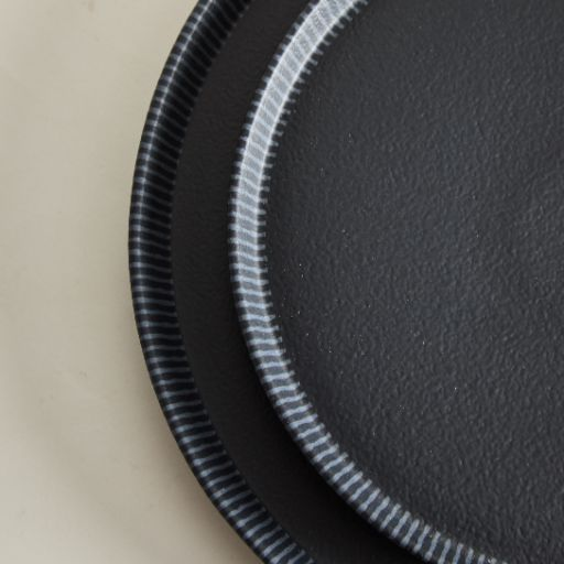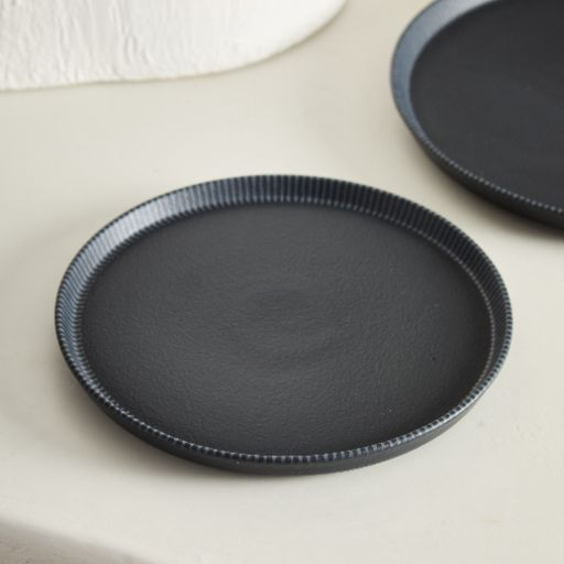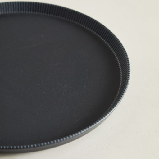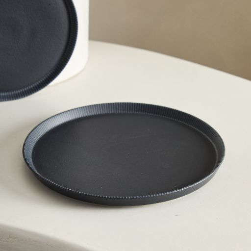Plato playo realizado en gres, de 27cm de diametro x 2,5cm de altura. Color negro opaco con rayas en los bordes. Apto lavavajillas y microondas.