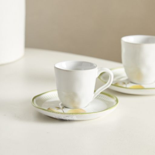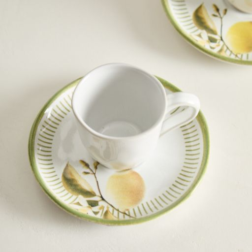Incluye taza de café y platito. Realizado en gres. Medidas:
